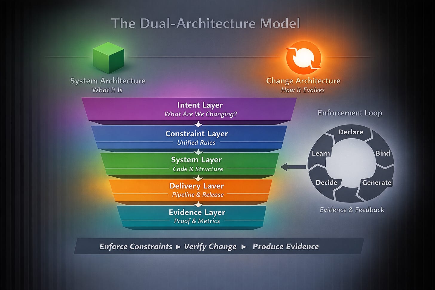 The system therefore guarantees that architectural evolution can only occur through explicit, reviewed, and versioned changes.